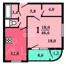 Общая 44,5 кв. м (жилая 18,1 кв. м + просторная кухня 12 кв. м). Планировка позволяет организовать комфортное пространство для одного или двоих человек.