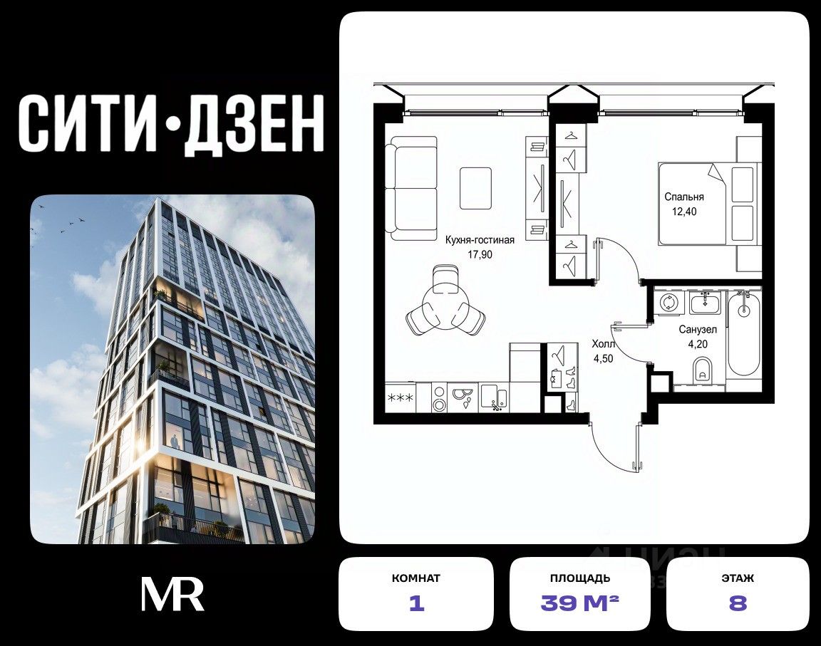 Продается 1-комнатная квартира от застройщика в жилом мультиквартале СИТИДЗЕН на 8-м этаже в корпусе #5. Общая площадь лота составляет 39 м²