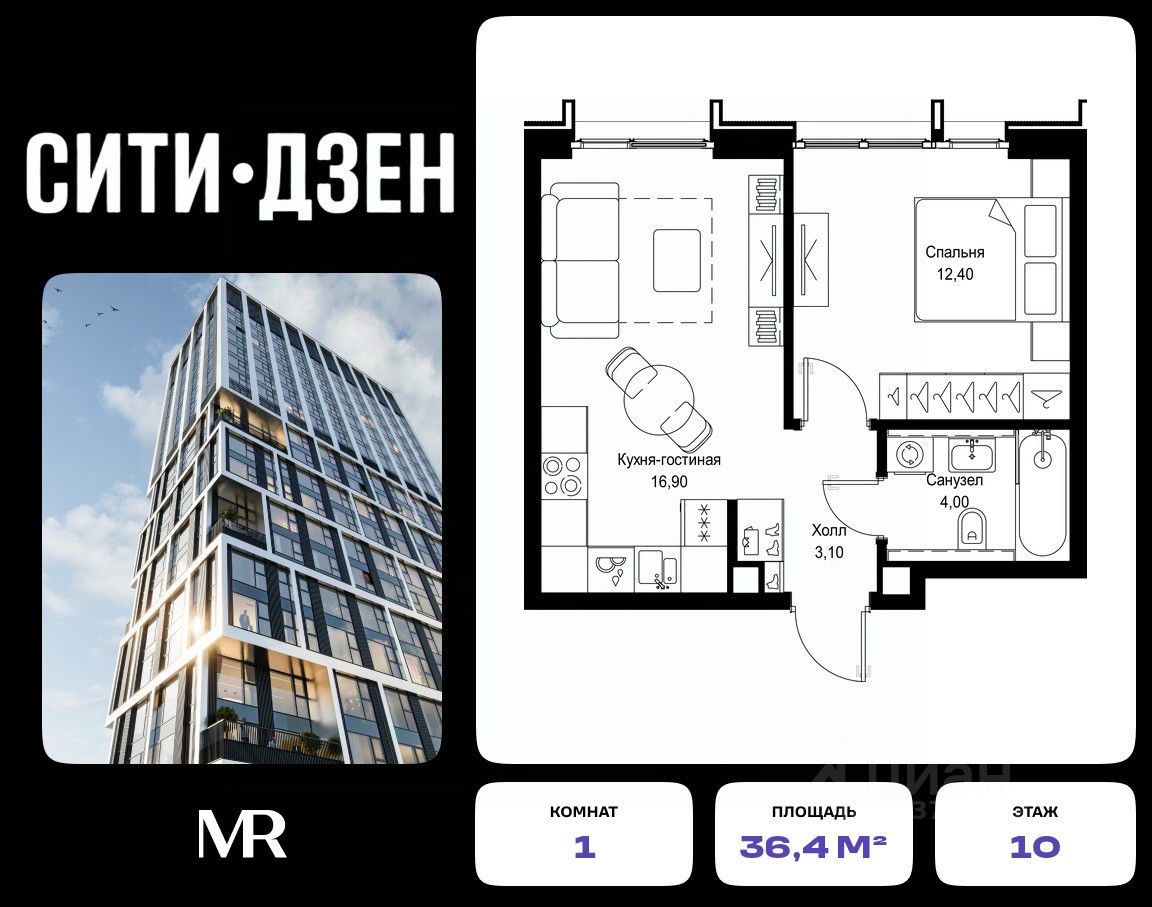 Продается 1-комнатная квартира от застройщика в жилом мультиквартале СИТИДЗЕН на 10-м этаже в корпусе #4. Общая площадь лота составляет 36.40 м²