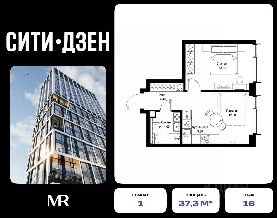 Продается 1-комнатная квартира от застройщика в жилом мультиквартале СИТИДЗЕН на 16-м этаже в корпусе #3. Общая площадь лота составляет 37.30 м²