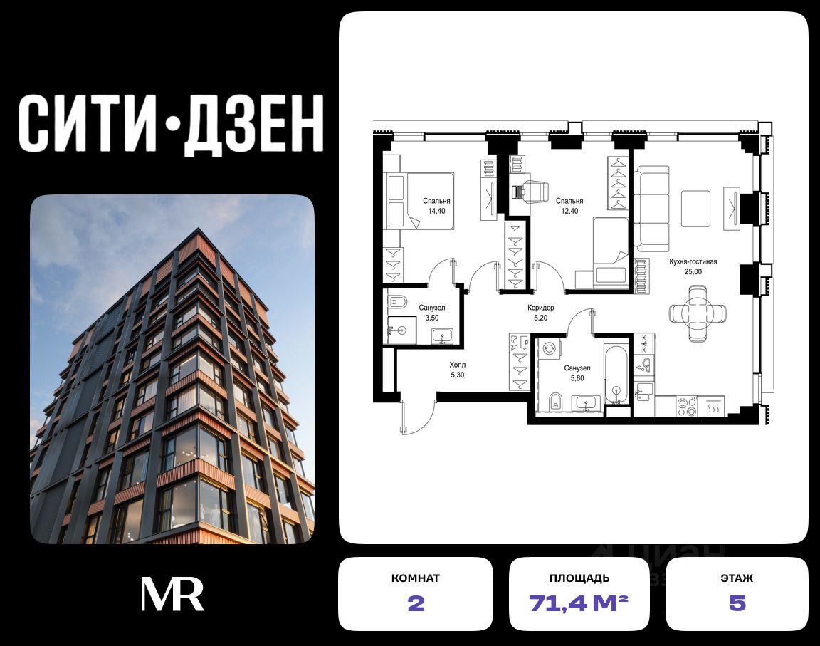Продается 2-комнатная квартира от застройщика в жилом мультиквартале СИТИДЗЕН на 5-м этаже в корпусе #2. Общая площадь лота составляет 71.40 м²