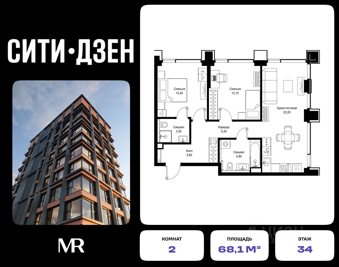 Продается 2-комнатная квартира от застройщика в жилом мультиквартале СИТИДЗЕН на 34-м этаже в корпусе #2. Общая площадь лота составляет 68.10 м²