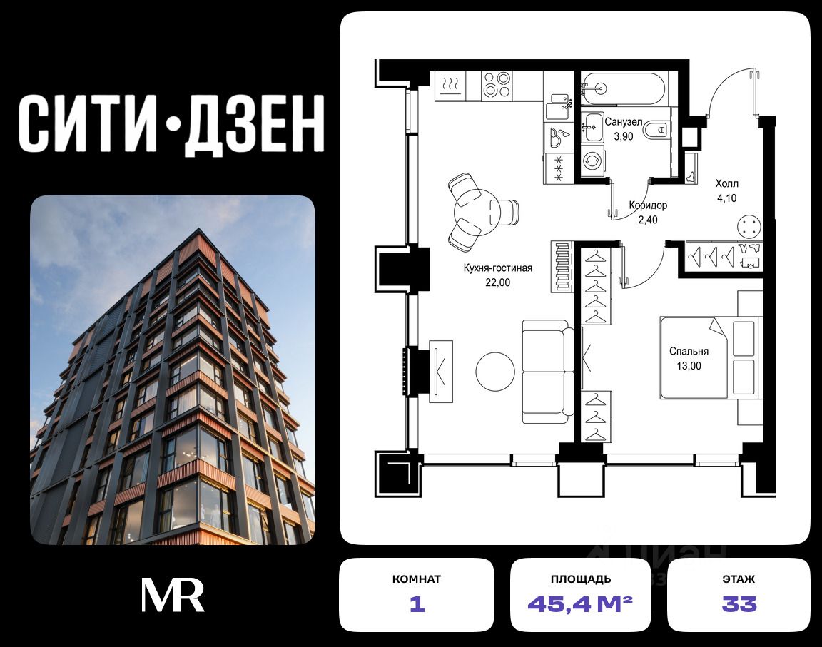 Продается 1-комнатная квартира от застройщика в жилом мультиквартале СИТИДЗЕН на 33-м этаже в корпусе #2. Общая площадь лота составляет 45.40 м²