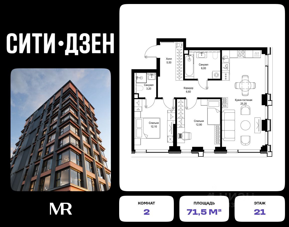 Продается 2-комнатная квартира от застройщика в жилом мультиквартале СИТИДЗЕН на 21-м этаже в корпусе #2. Общая площадь лота составляет 71.50 м²