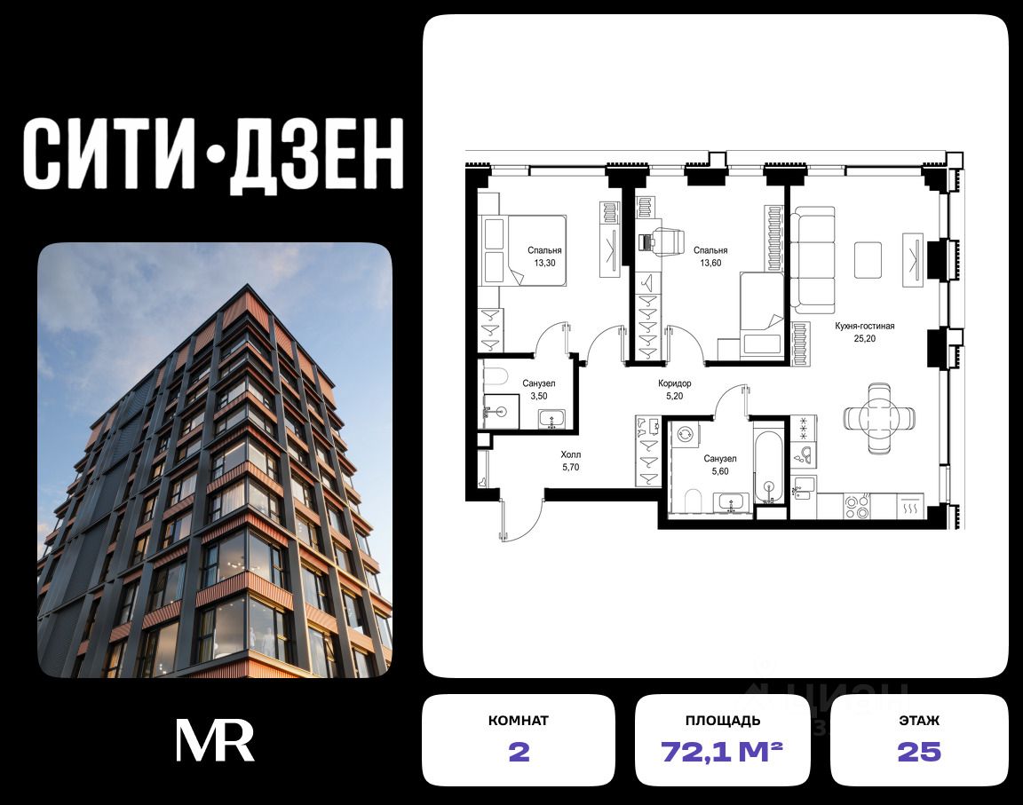 Продается 2-комнатная квартира от застройщика в жилом мультиквартале СИТИДЗЕН на 25-м этаже в корпусе #2. Общая площадь лота составляет 72.10 м²