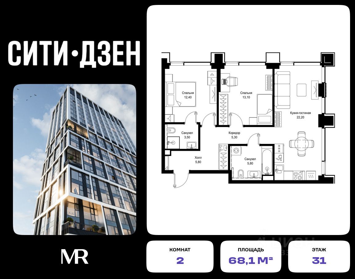 Продается 2-комнатная квартира от застройщика в жилом мультиквартале СИТИДЗЕН на 31-м этаже в корпусе #2. Общая площадь лота составляет 68.10 м²