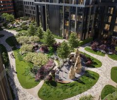 Концепция благоустройства территории мультиквартала предусматривает большое количество вечнозеленых растений, что создает ощущение максимальной близости к природе. Жителей квартала ждут места для отдыха, игр, занятий спортом и прогулок с домашними питомцами. В приватном дворе с собственным садом предусмотрена зеленая комьюнити-гостиная для дружеского отдыха и общения, одна из стен которой подходит для кинопроекций, а также зеленый рабочий кабинет в саду (бизнес-гардена), оборудованный wi-fi станцией и usb-разъёмами для зарядки устройств. Маленьких жителей ждут авторские игровые площадки для разных возрастных групп (от 0 до 12 лет).