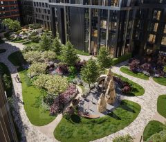 Концепция благоустройства территории мультиквартала предусматривает большое количество вечнозеленых растений, что создает ощущение максимальной близости к природе. Жителей квартала ждут места для отдыха, игр, занятий спортом и прогулок с домашними питомцами. В приватном дворе с собственным садом предусмотрена зеленая комьюнити-гостиная для дружеского отдыха и общения, одна из стен которой подходит для кинопроекций, а также зеленый рабочий кабинет в саду (бизнес-гардена), оборудованный wi-fi станцией и usb-разъёмами для зарядки устройств. Маленьких жителей ждут авторские игровые площадки для разных возрастных групп (от 0 до 12 лет).