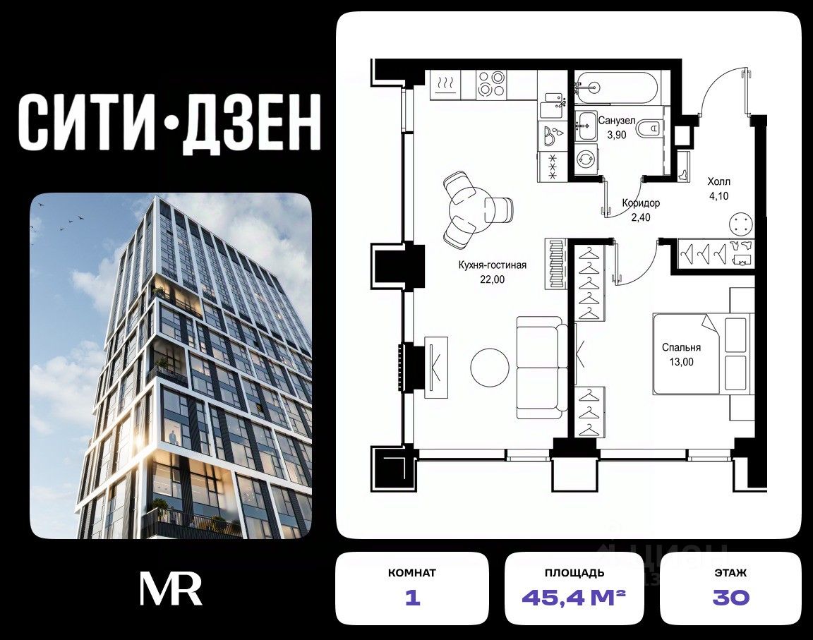 Продается 1-комнатная квартира от застройщика в жилом мультиквартале СИТИДЗЕН на 30-м этаже в корпусе #2. Общая площадь лота составляет 45.40 м²