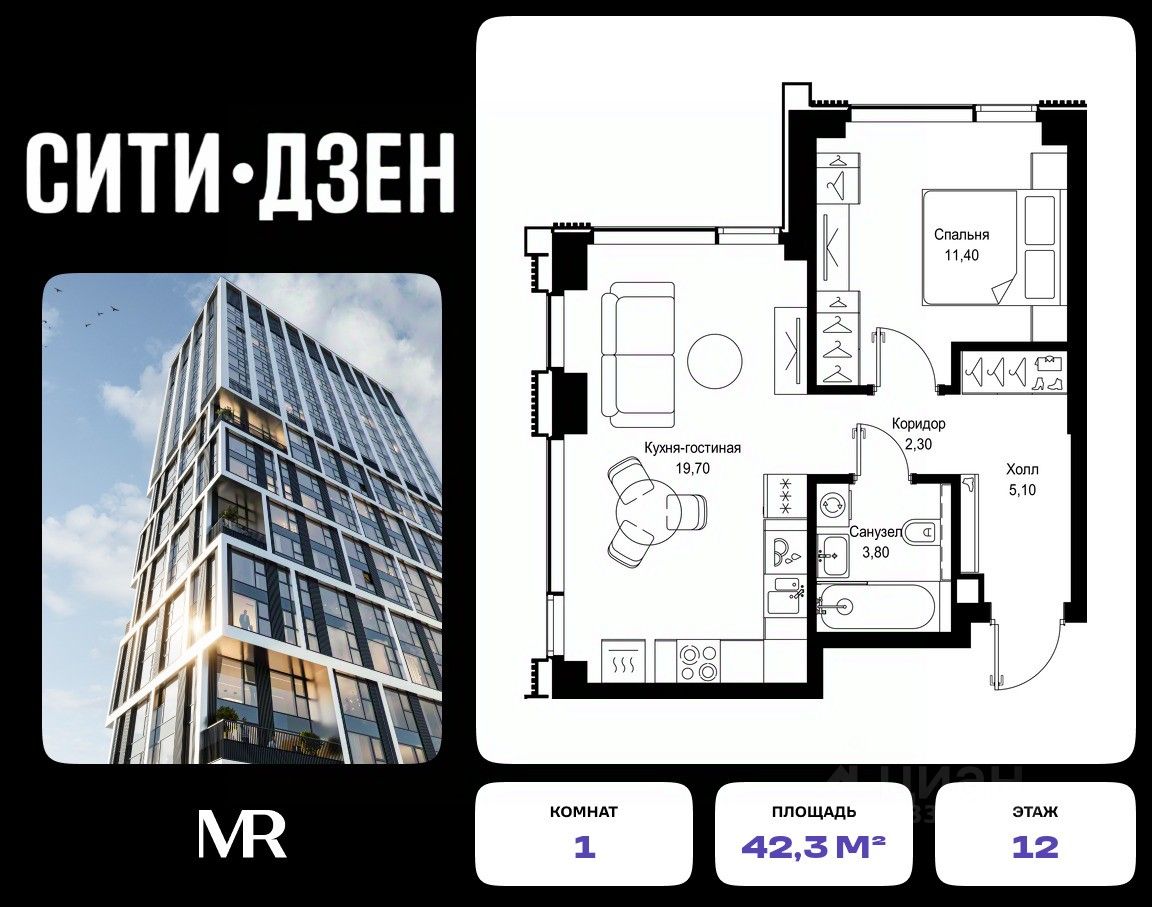 Продается 1-комнатная квартира от застройщика в жилом мультиквартале СИТИДЗЕН на 12-м этаже в корпусе #2. Общая площадь лота составляет 42.30 м²