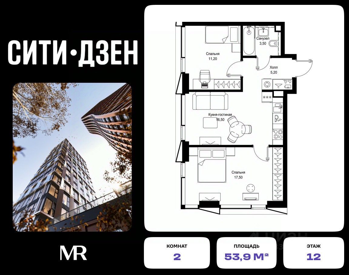 Продается 2-комнатная квартира от застройщика в жилом мультиквартале СИТИДЗЕН на 12-м этаже в корпусе #7. Общая площадь лота составляет 53.90 м²