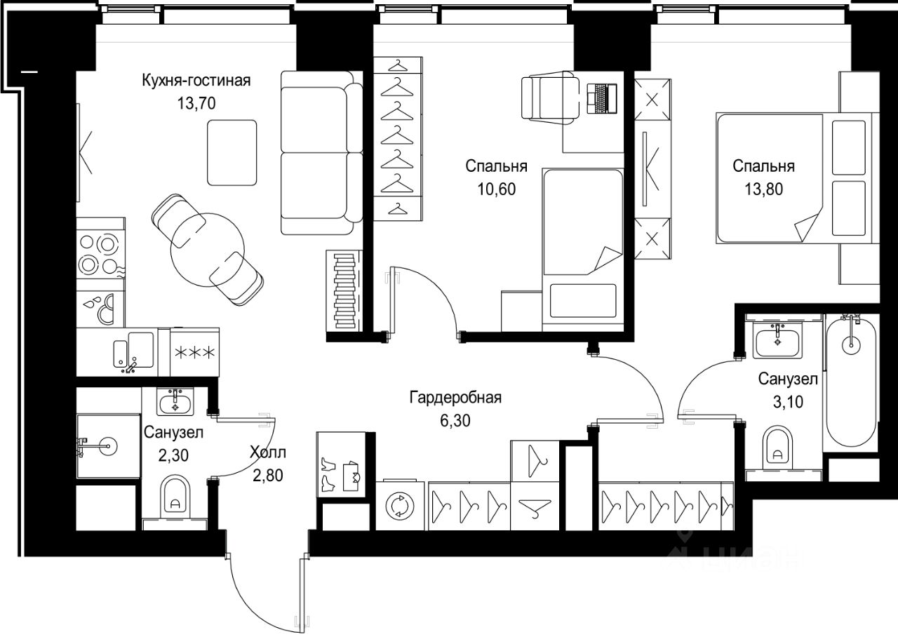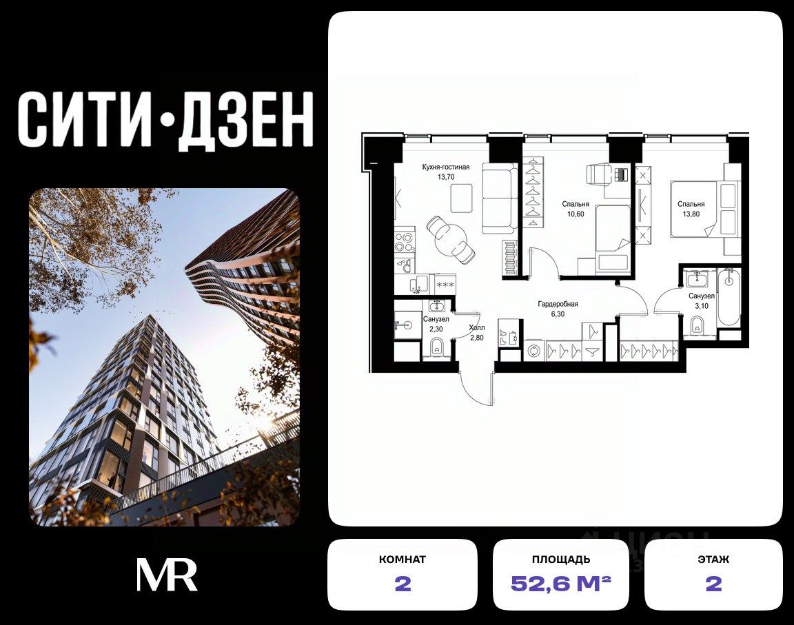 Продается 2-комнатная квартира от застройщика в жилом мультиквартале СИТИДЗЕН на 2-м этаже в корпусе #6. Общая площадь лота составляет 52.60 м²