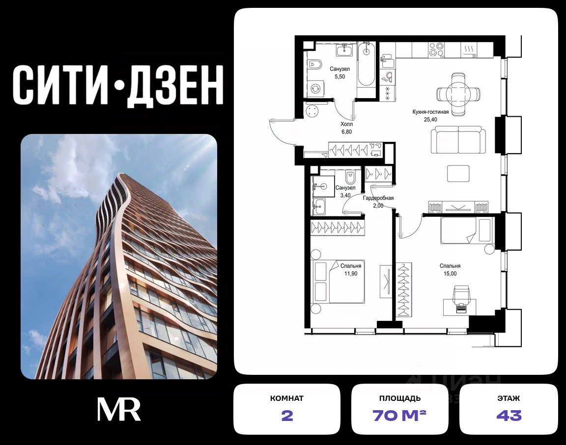 Продается 2-комнатная квартира от застройщика в жилом мультиквартале СИТИДЗЕН на 43-м этаже в корпусе #6. Общая площадь лота составляет 70 м²