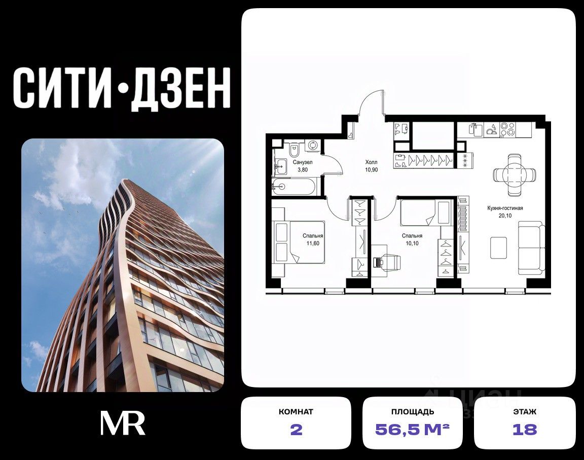 Продается 2-комнатная квартира от застройщика в жилом мультиквартале СИТИДЗЕН на 18-м этаже в корпусе #6. Общая площадь лота составляет 56.50 м²