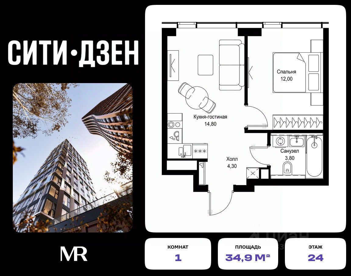 Продается 1-комнатная квартира от застройщика в жилом мультиквартале СИТИДЗЕН на 24-м этаже в корпусе #6. Общая площадь лота составляет 34.90 м²