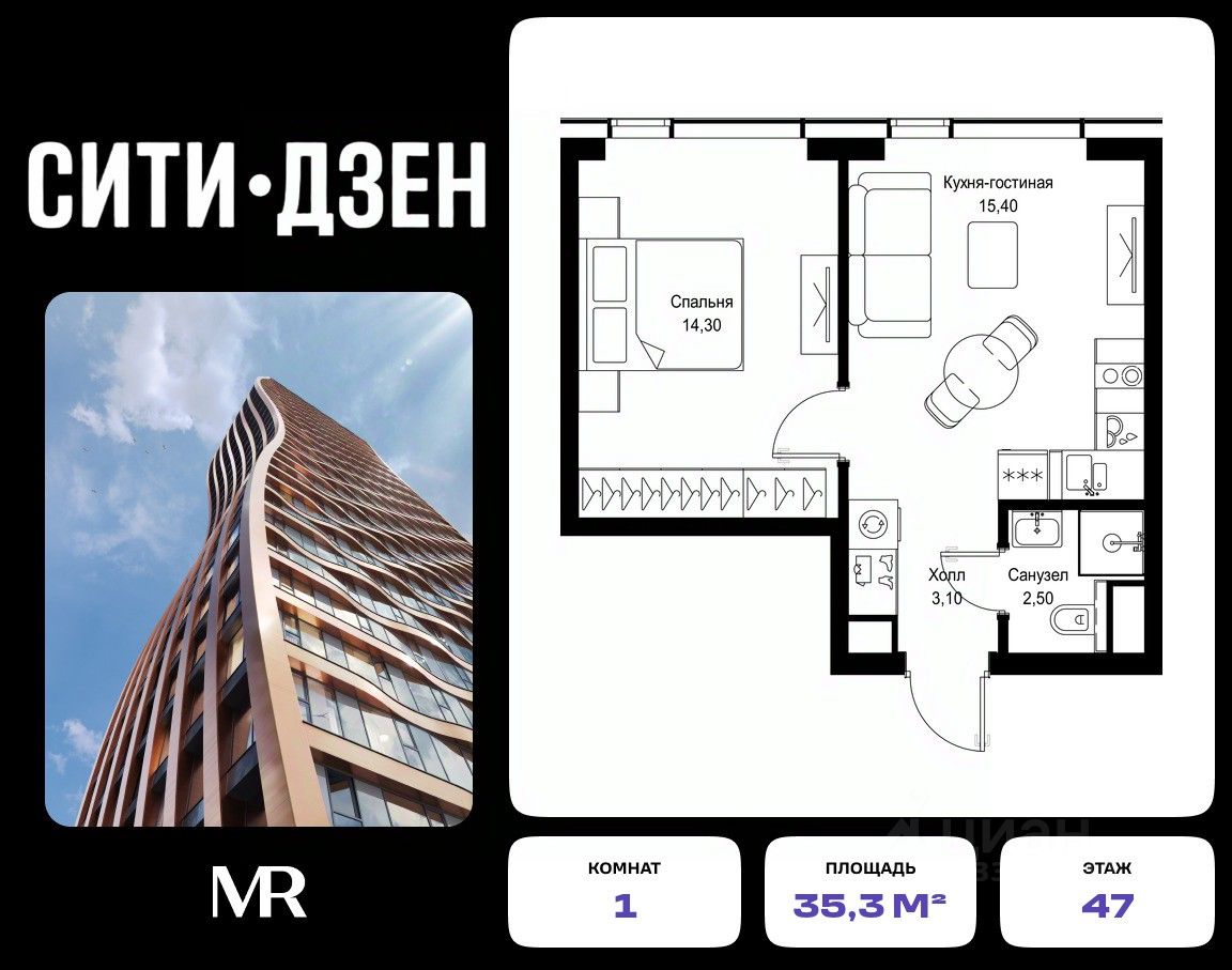 Продается 1-комнатная квартира от застройщика в жилом мультиквартале СИТИДЗЕН на 47-м этаже в корпусе #6. Общая площадь лота составляет 35.30 м²