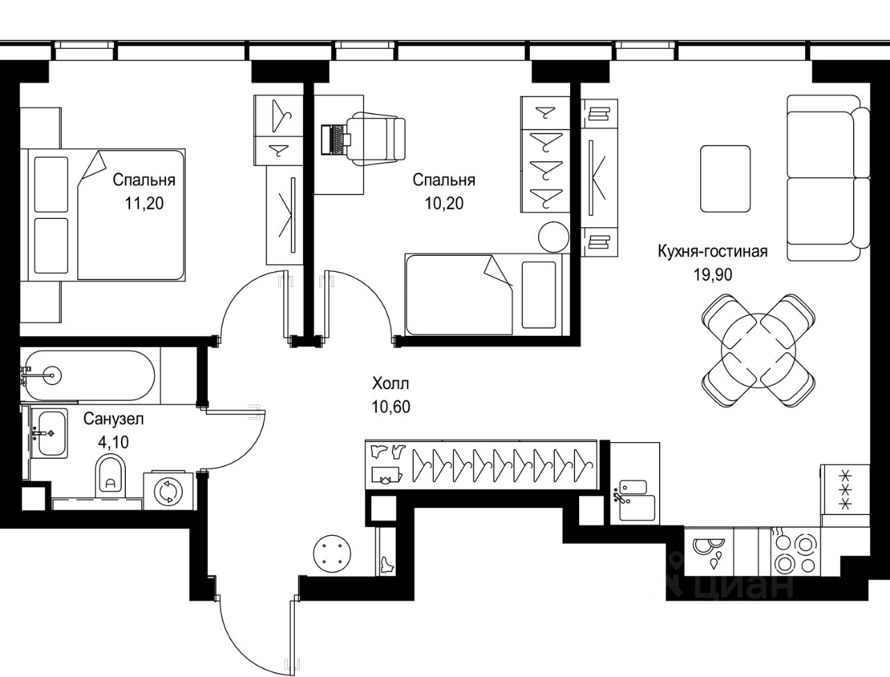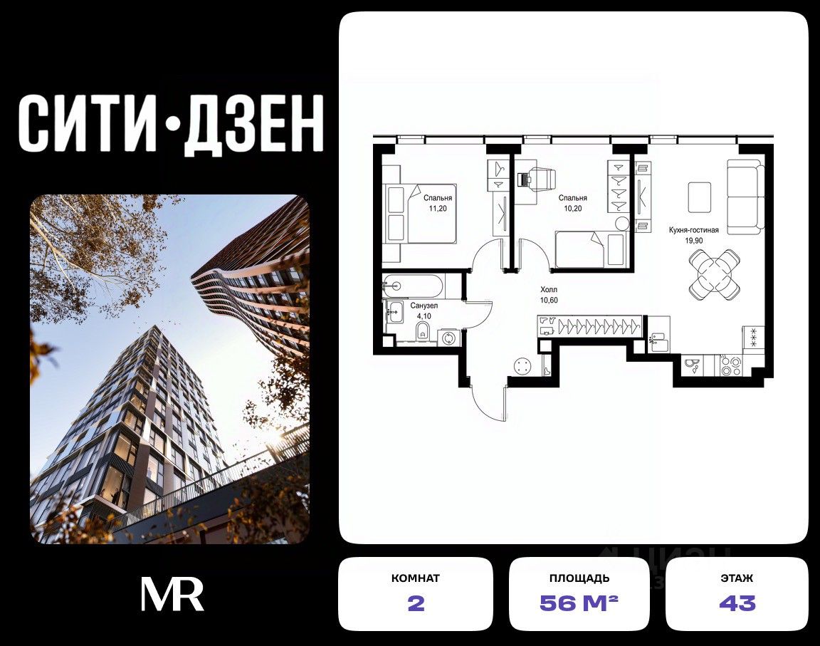 Продается 2-комнатная квартира от застройщика в жилом мультиквартале СИТИДЗЕН на 43-м этаже в корпусе #6. Общая площадь лота составляет 56 м²