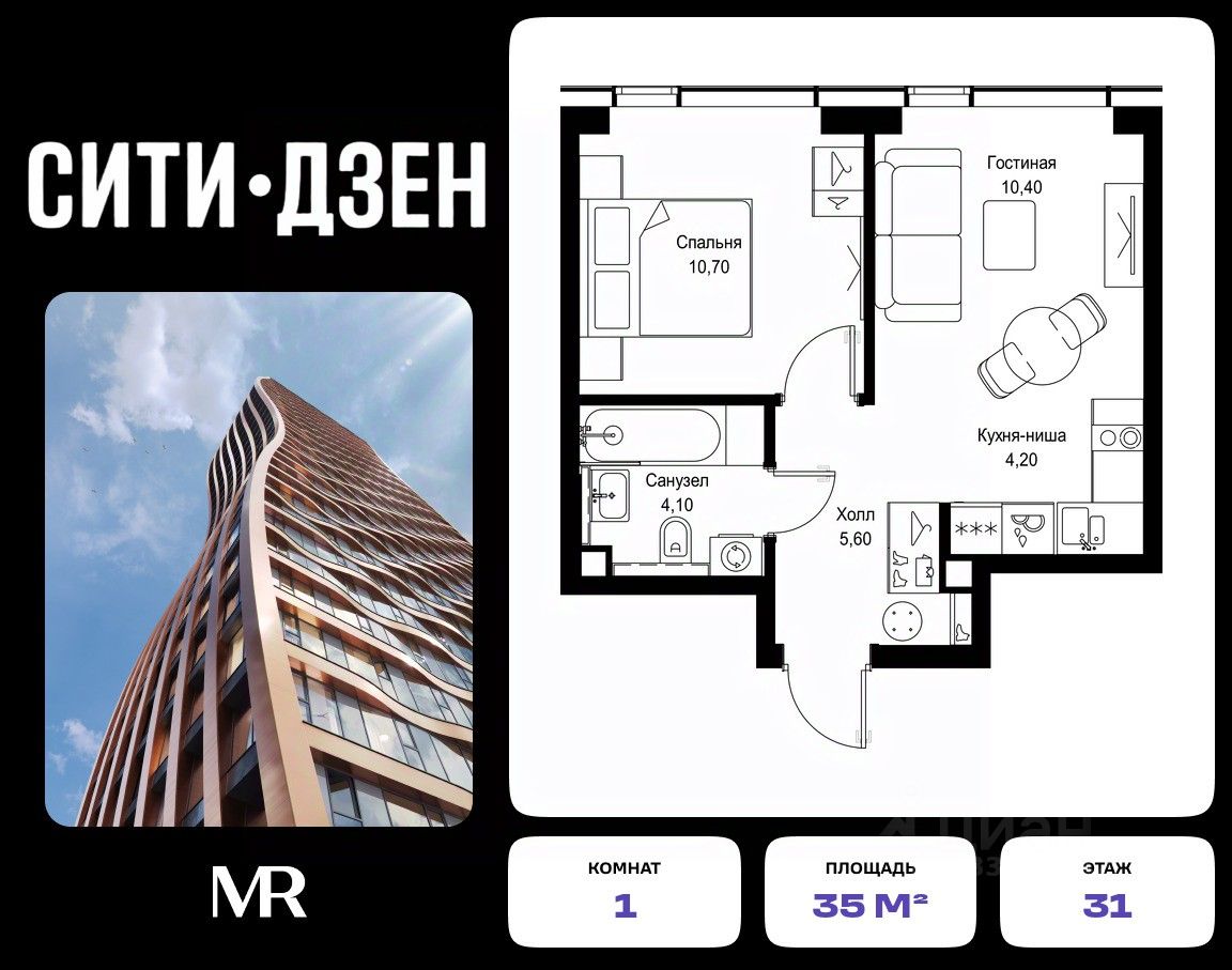 Продается 1-комнатная квартира от застройщика в жилом мультиквартале СИТИДЗЕН на 31-м этаже в корпусе #6. Общая площадь лота составляет 35 м²