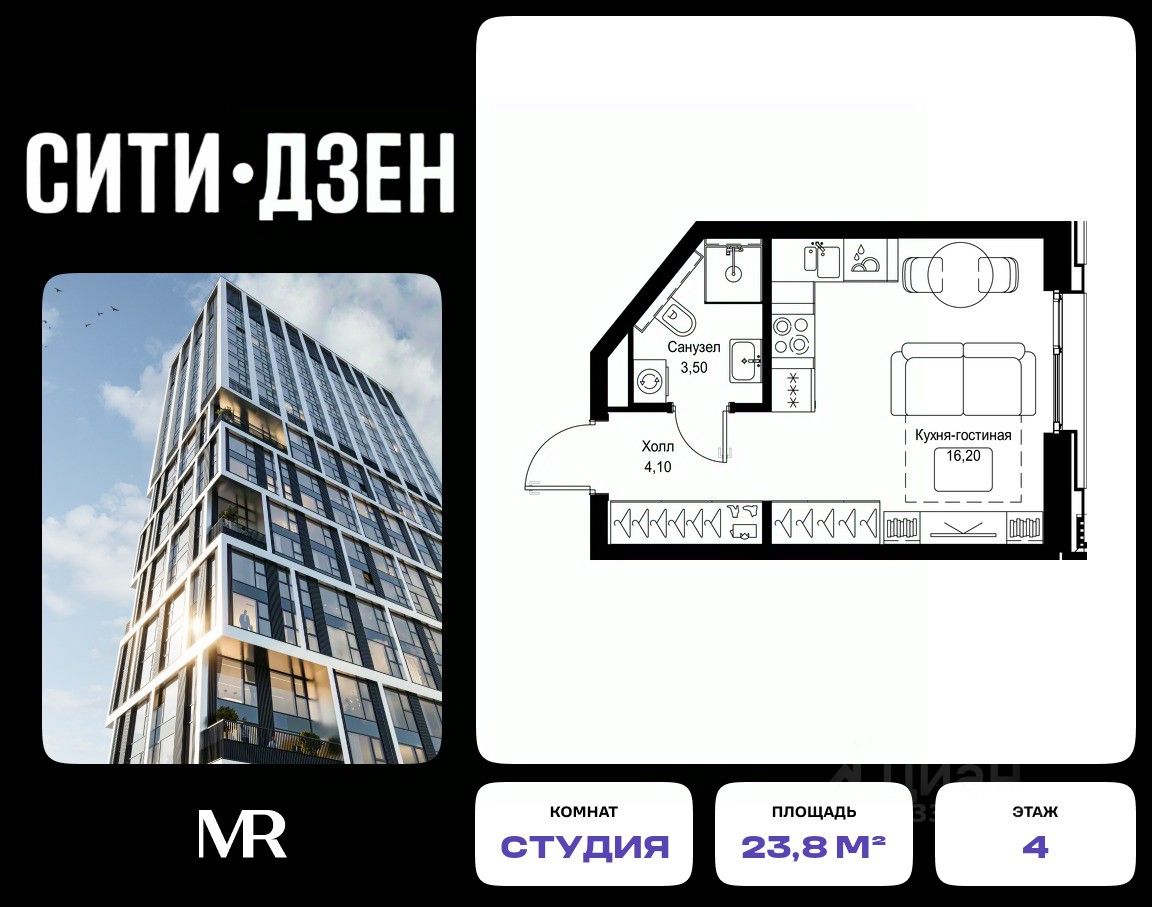 Продается студия от застройщика в жилом мультиквартале СИТИДЗЕН на 4-м этаже в корпусе #1. Общая площадь лота составляет 23.80 м²