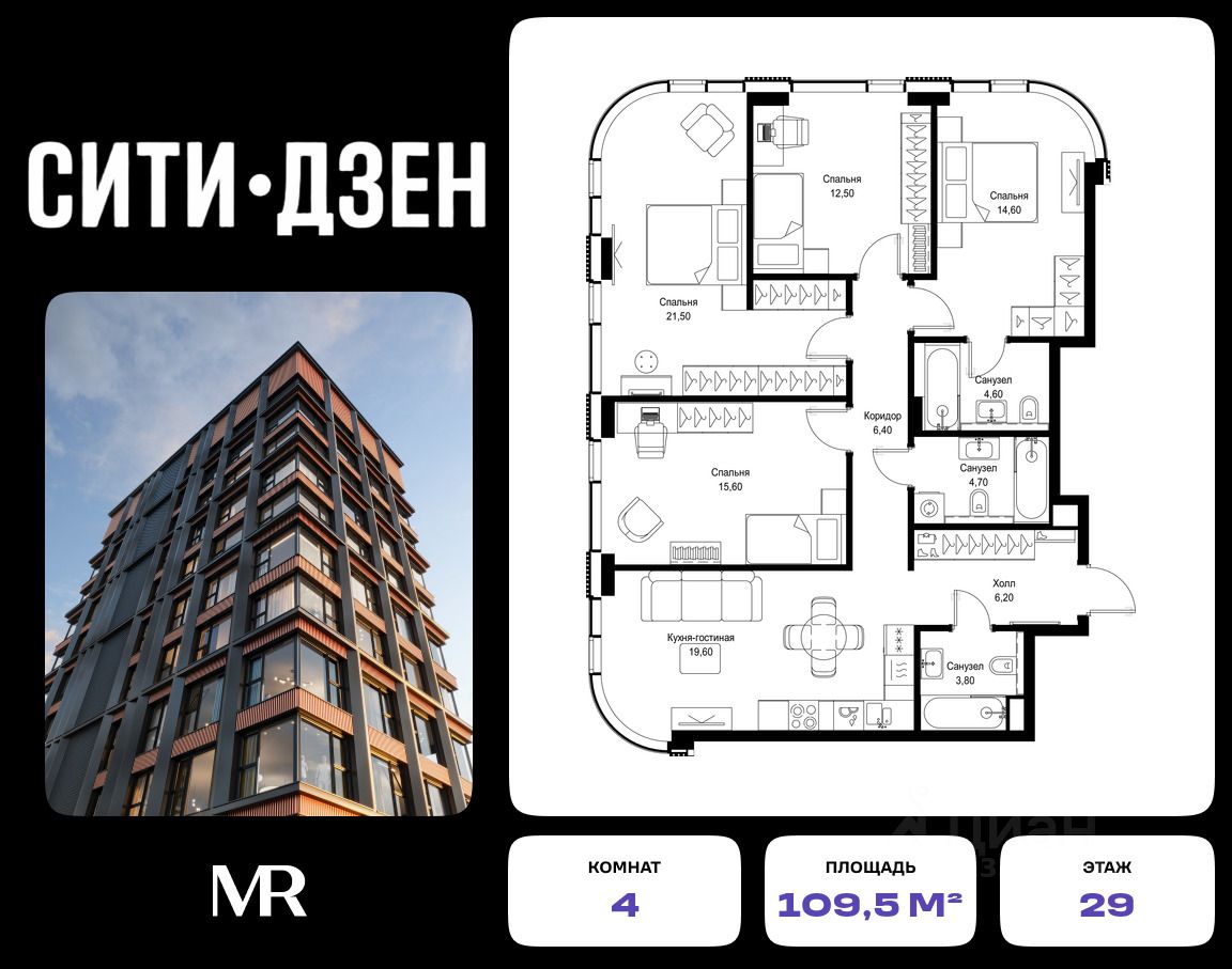 Продается 4-комнатная квартира от застройщика в жилом мультиквартале СИТИДЗЕН на 29-м этаже в корпусе #1. Общая площадь лота составляет 109.50 м²