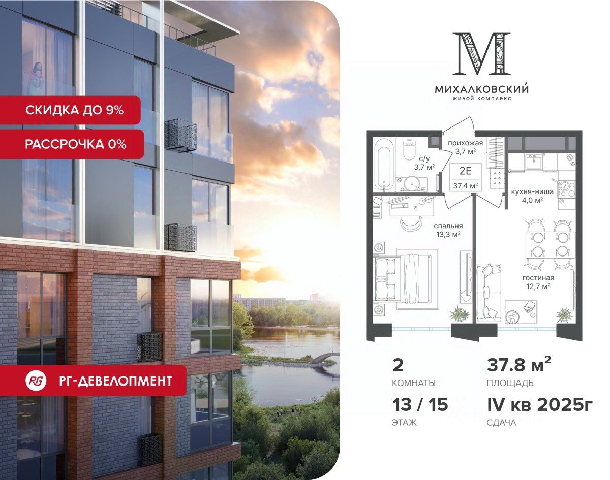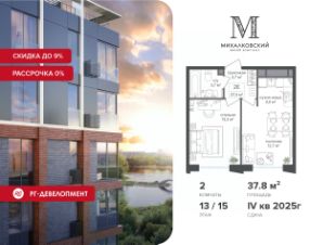 Продаётся 2-к квартира 37,8 кв.м. в ЖК "Михалковский" на 13-м этаже 15 этажного дома.