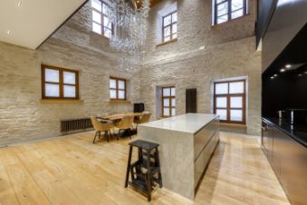 Отделка выполнена с акцентом на натуральные материалы и фактуру. Деревянные окна, инженерная доска из дуба и широкоформатный керамогранит Arch-Skin. Стены оформлены отреставрированным историческим кирпичом с защитным покрытием греческого производителя Koursanit. Межкомнатные двери изготовлены из массива дуба. Апартаменты укомплектованы кухонным гарнитуром со встроенной техникой Neff и Liebherr. В санузлах - сантехника Hansgrohe, Duravit и Kaldewei, теплые полы. Освещение организовано по нескольким сценариям с возможностью дистанционного управления через систему Casambi.