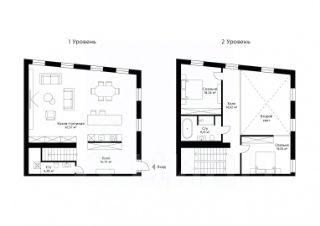 Планировочное решение таунхауса выстроено вокруг просторной кухни-гостиной со вторым светом, которая формирует главное жилое пространство и задает архитектурный характер апартаментам. Высокие потолки (в коньке - 12 м) и большие окна наполняют интерьер естественным светом, подчеркивая объем помещения. На втором уровне расположены две спальни, обеспечивающие приватность и комфорт, а также второй санузел. Всего в апартаментах предусмотрено два санузла и функциональный холл.
