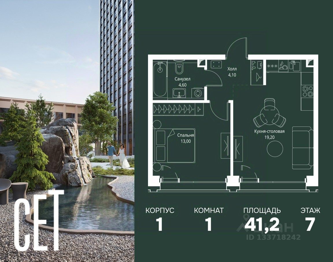В ЖК Сет продается 1-комнатная квартира площадью 41.20 м², расположенная в корпусе 1, на 7 этаже 18 этажного дома.