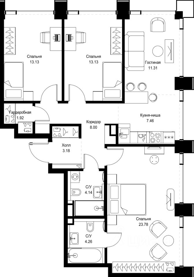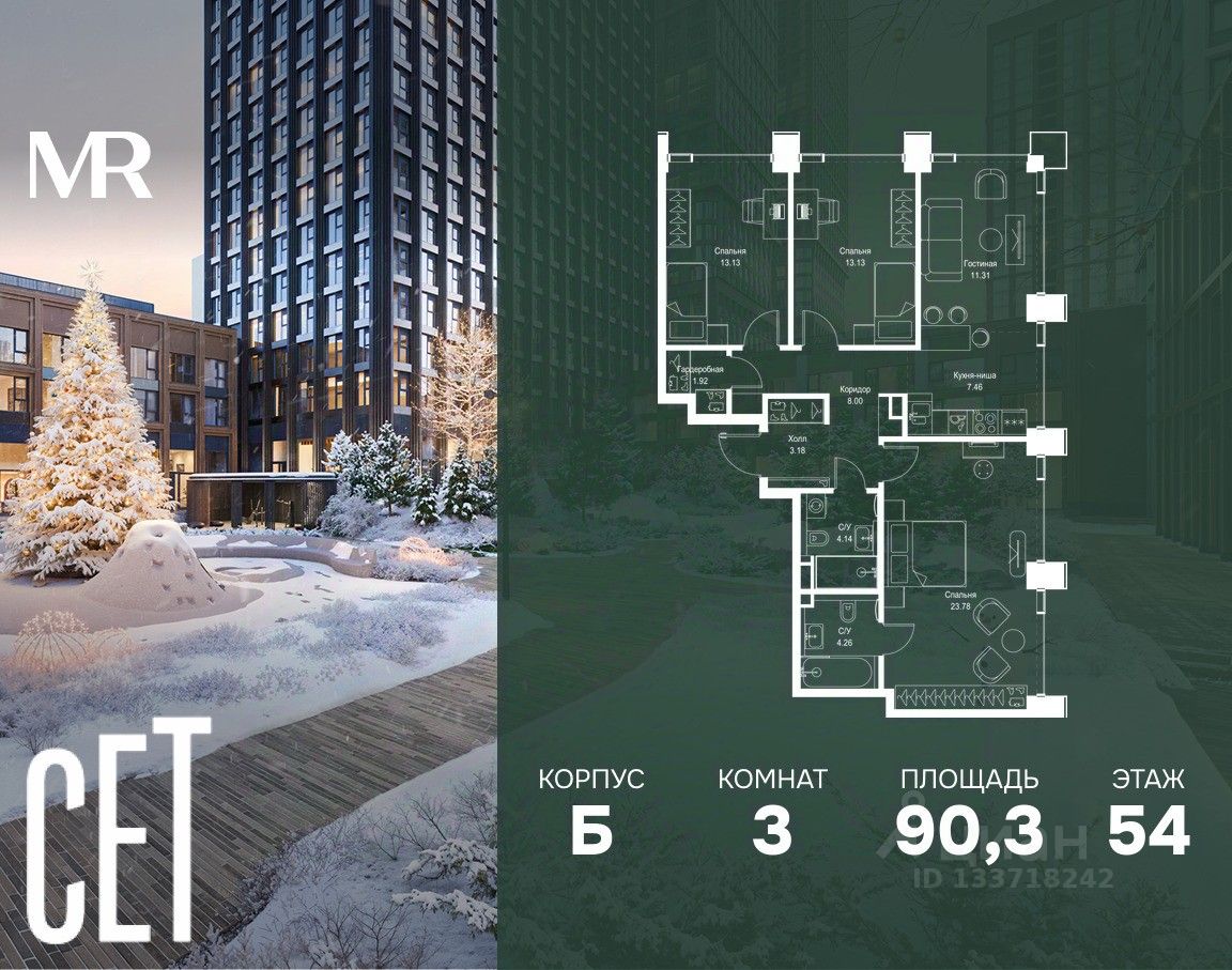 В ЖК Сет продается 3-комнатная квартира площадью 90.31 м², расположенная в корпусе Б, на 54 этаже 59 этажного дома.