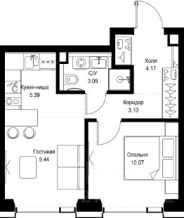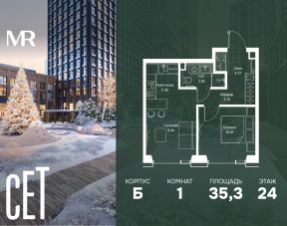 В ЖК Сет продается 1-комнатная квартира площадью 35.26 м², расположенная в корпусе Б, на 24 этаже 59 этажного дома.