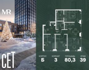 В ЖК Сет продается 3-комнатная квартира площадью 80.33 м², расположенная в корпусе Б, на 39 этаже 59 этажного дома.
