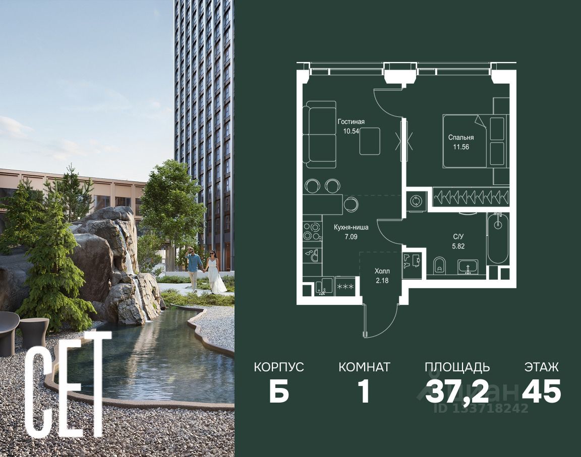 В ЖК Сет продается 1-комнатная квартира площадью 37.19 м², расположенная в корпусе Б, на 45 этаже 59 этажного дома.