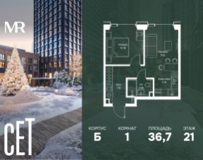 В ЖК Сет продается 1-комнатная квартира площадью 36.65 м², расположенная в корпусе Б, на 21 этаже 59 этажного дома.