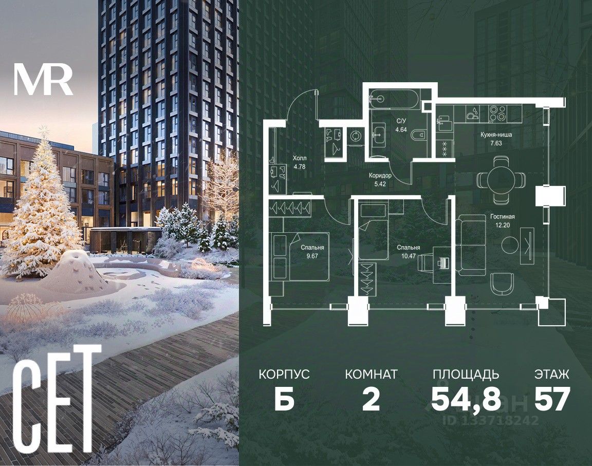 В ЖК Сет продается 2-комнатная квартира площадью 54.81 м², расположенная в корпусе Б, на 57 этаже 59 этажного дома.