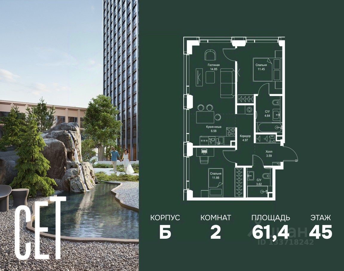 В ЖК Сет продается 2-комнатная квартира площадью 61.36 м², расположенная в корпусе Б, на 45 этаже 59 этажного дома.