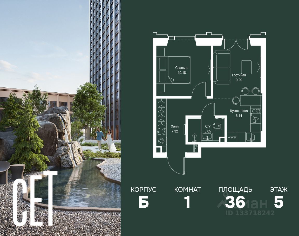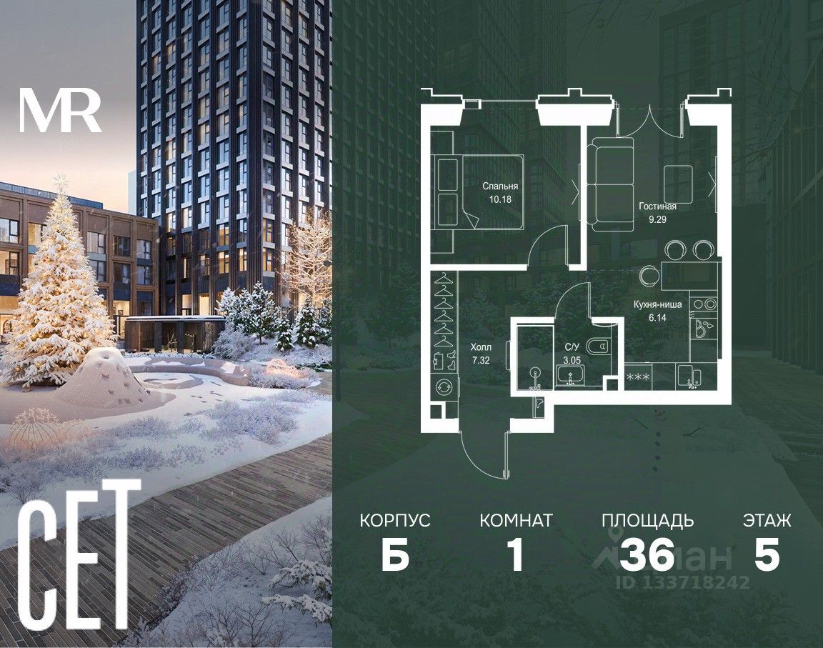 В ЖК Сет продается 1-комнатная квартира площадью 35.98 м², расположенная в корпусе Б, на 5 этаже 59 этажного дома.