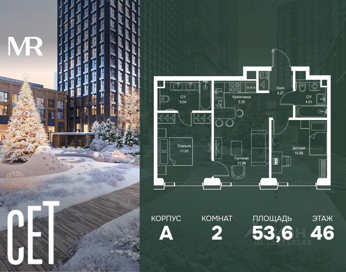 В ЖК Сет продается 2-комнатная квартира площадью 53.56 м², расположенная в корпусе А, на 46 этаже 52 этажного дома.