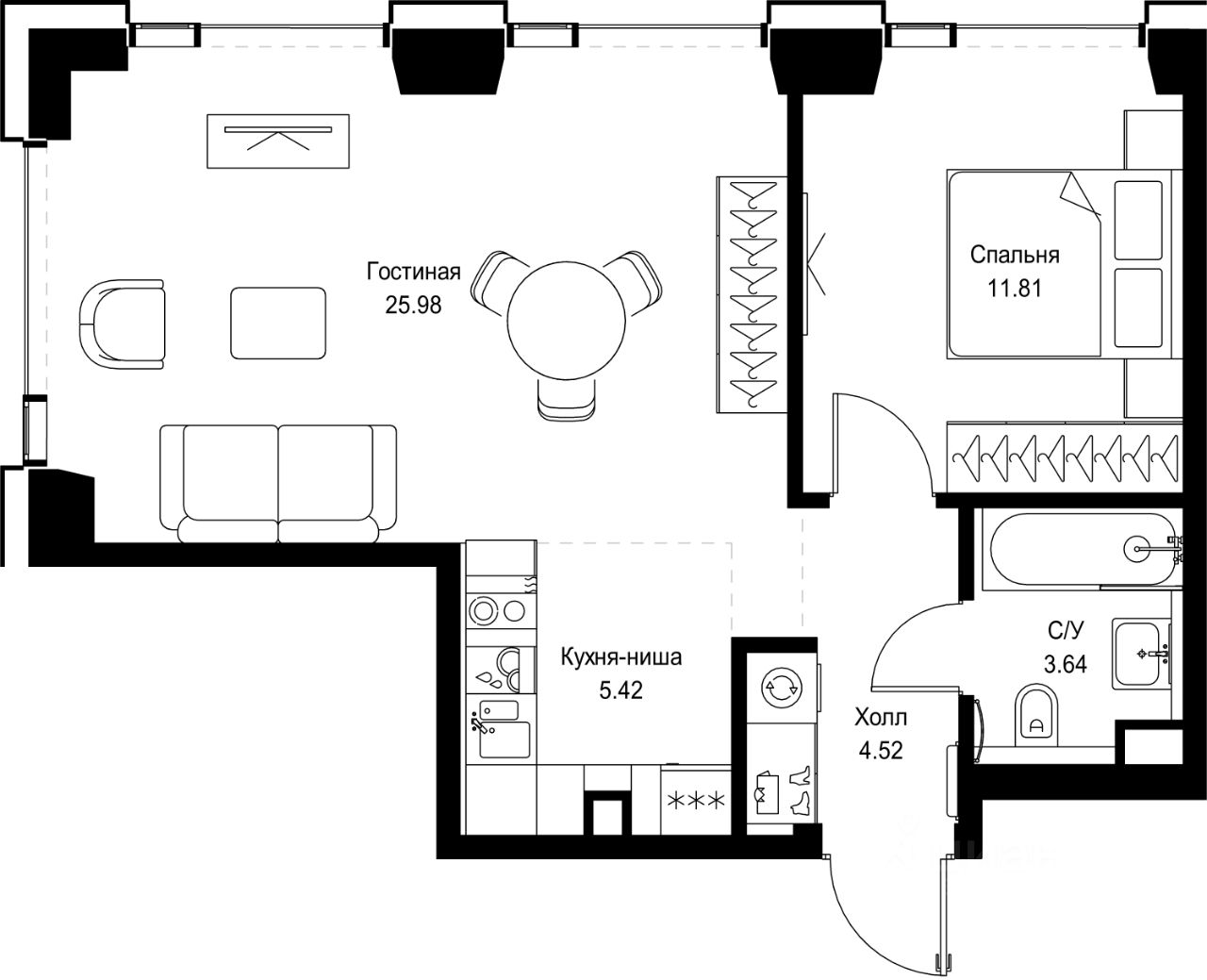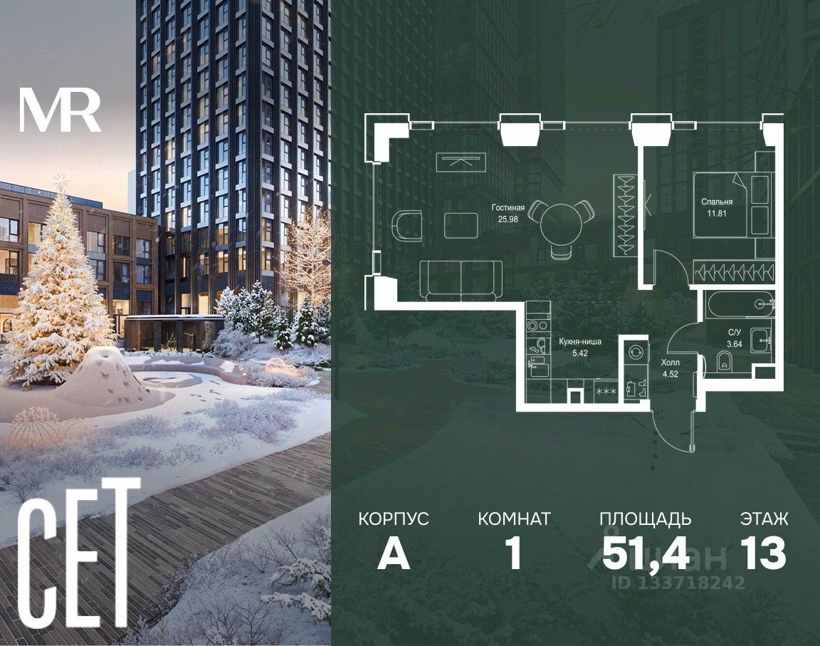 В ЖК Сет продается 1-комнатная квартира площадью 51.37 м², расположенная в корпусе А, на 13 этаже 52 этажного дома.