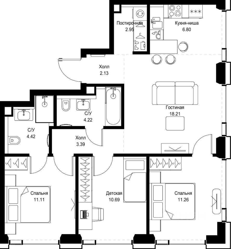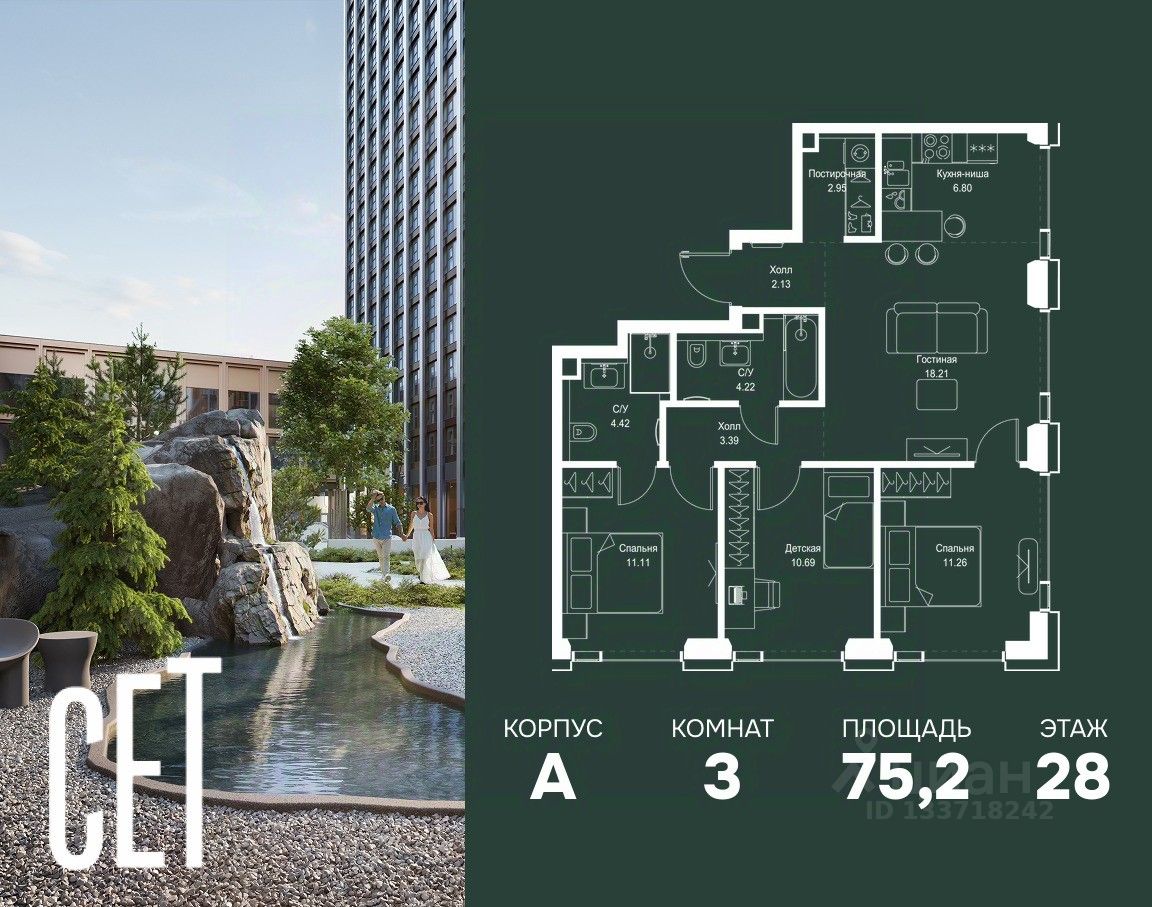 В ЖК Сет продается 3-комнатная квартира площадью 75.18 м², расположенная в корпусе А, на 28 этаже 52 этажного дома.