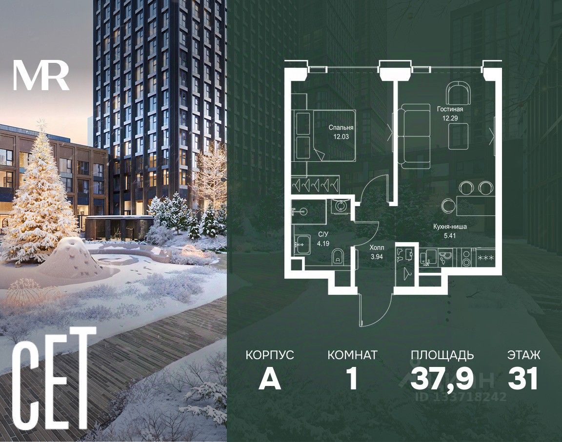 В ЖК Сет продается 1-комнатная квартира площадью 37.86 м², расположенная в корпусе А, на 31 этаже 52 этажного дома.