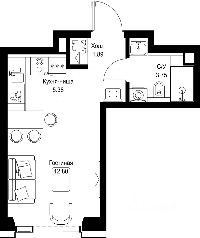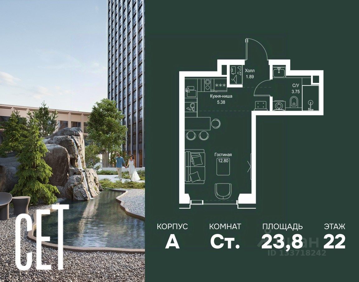 В ЖК Сет продается студия площадью 23.82 м², расположенная в корпусе А, на 22 этаже 52 этажного дома.