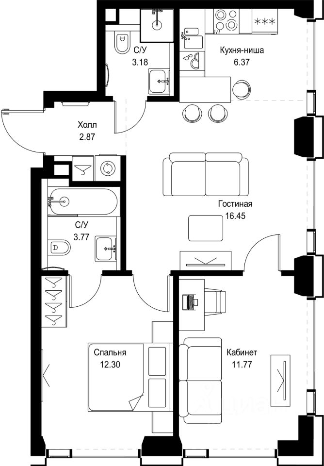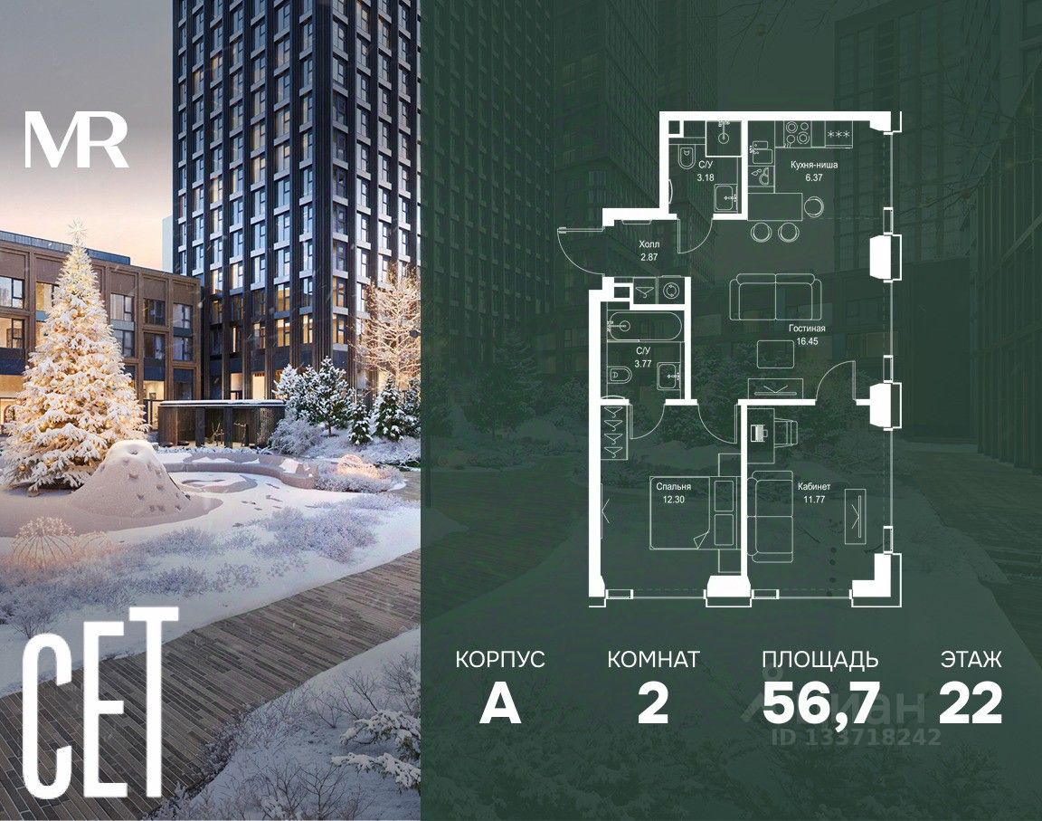 В ЖК Сет продается 2-комнатная квартира площадью 56.71 м², расположенная в корпусе А, на 22 этаже 52 этажного дома.