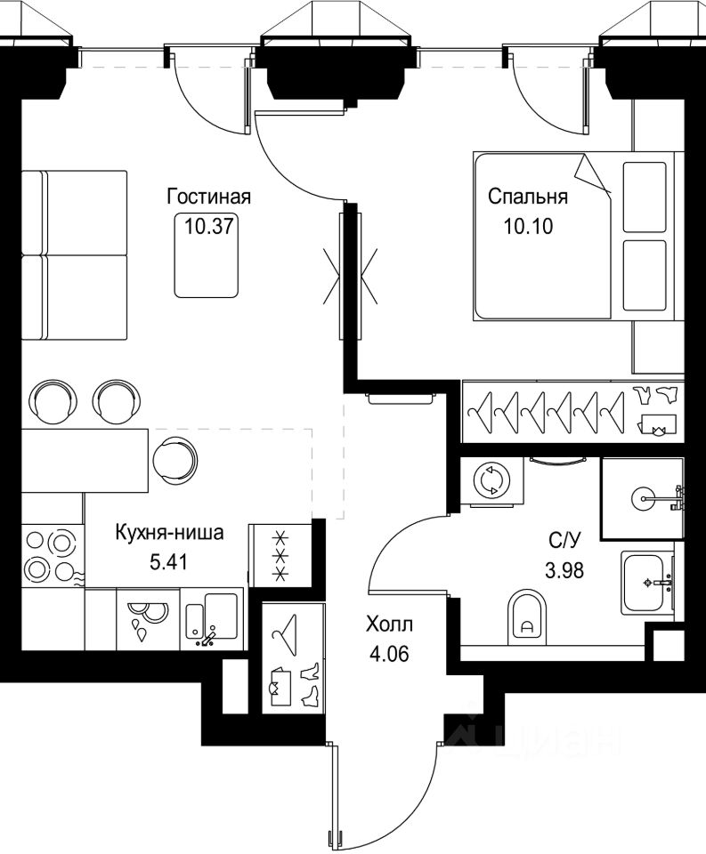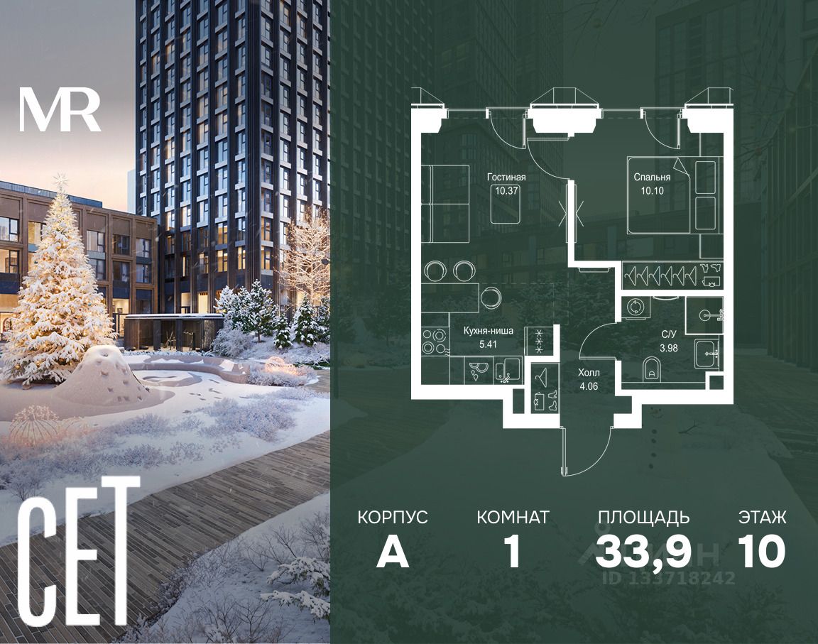 В ЖК Сет продается 1-комнатная квартира площадью 33.92 м², расположенная в корпусе А, на 10 этаже 52 этажного дома.