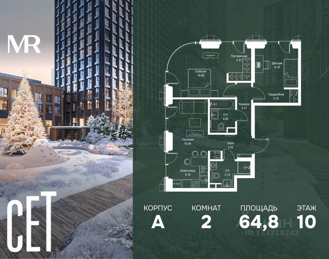 В ЖК Сет продается 2-комнатная квартира площадью 64.81 м², расположенная в корпусе А, на 10 этаже 52 этажного дома.