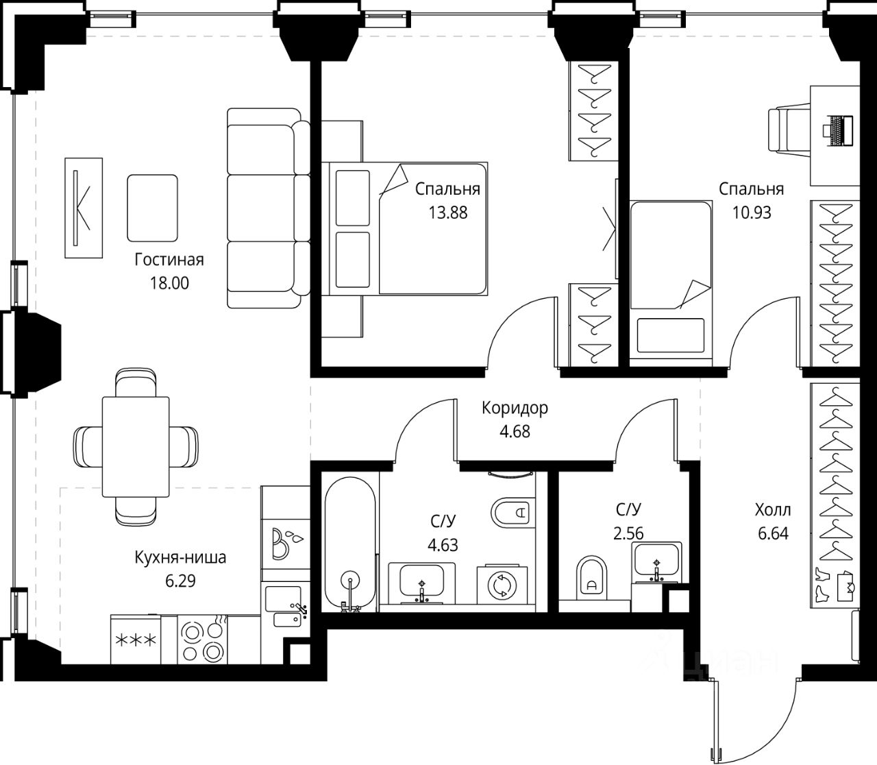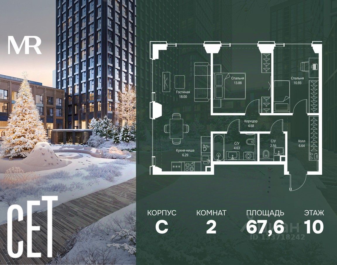 В ЖК Сет продается 2-комнатная квартира площадью 67.61 м², расположенная в корпусе С, на 10 этаже 28 этажного дома.