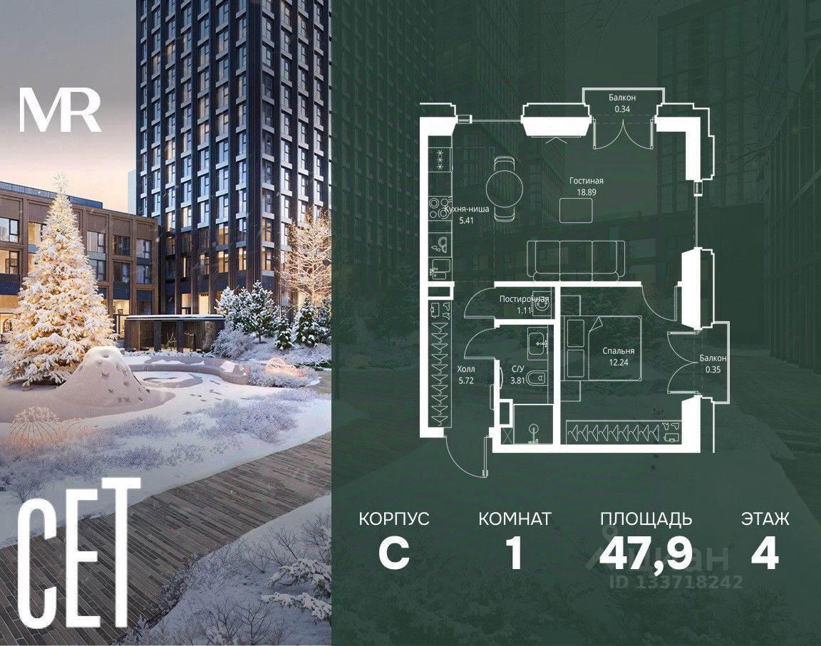 В ЖК Сет продается 1-комнатная квартира площадью 47.87 м², расположенная в корпусе С, на 4 этаже 28 этажного дома.