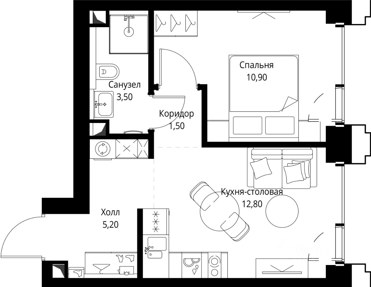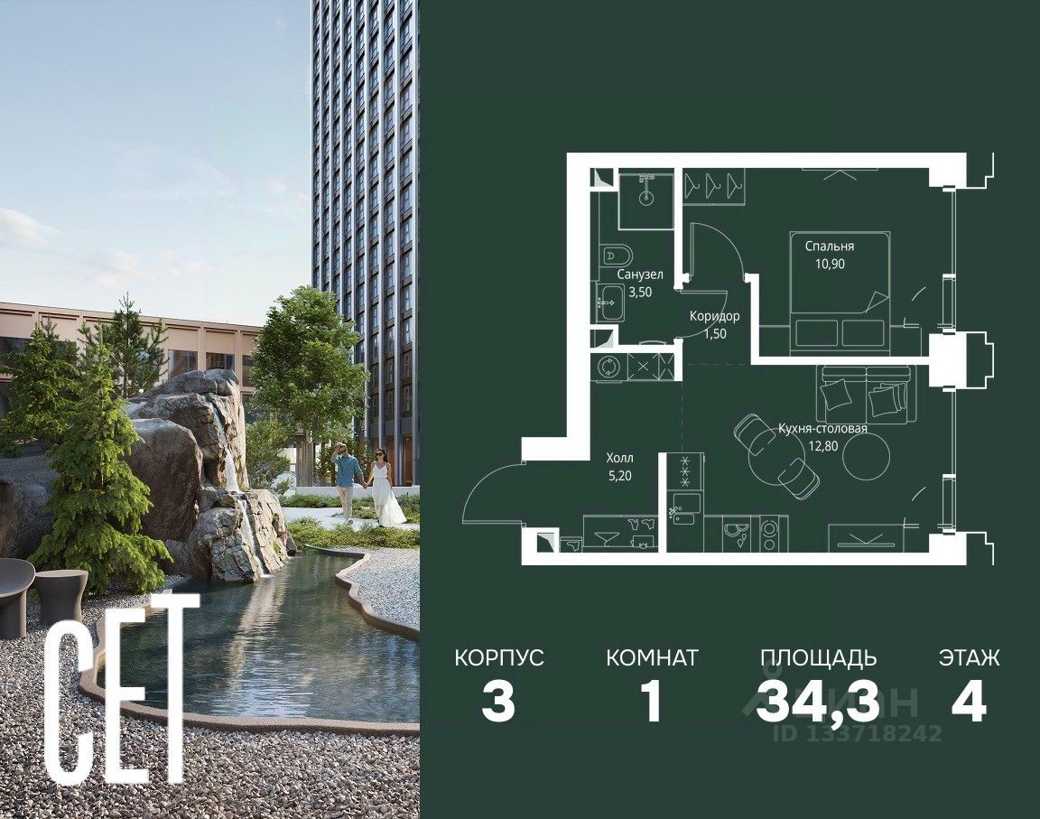 В ЖК Сет продается 1-комнатная квартира площадью 34.30 м², расположенная в корпусе 3, на 4 этаже 45 этажного дома.