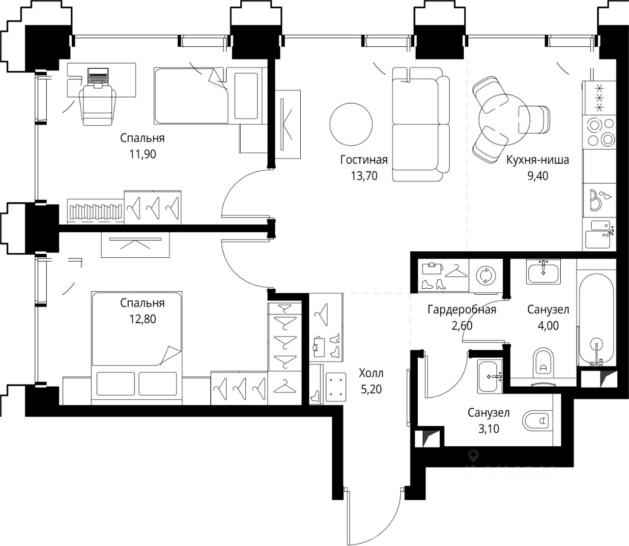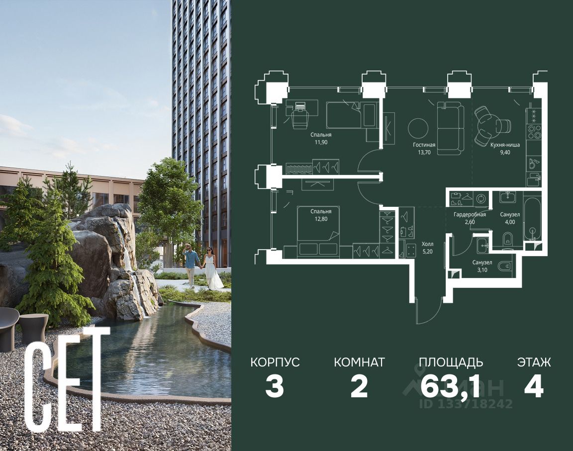В ЖК Сет продается 2-комнатная квартира площадью 63.10 м², расположенная в корпусе 3, на 4 этаже 45 этажного дома.