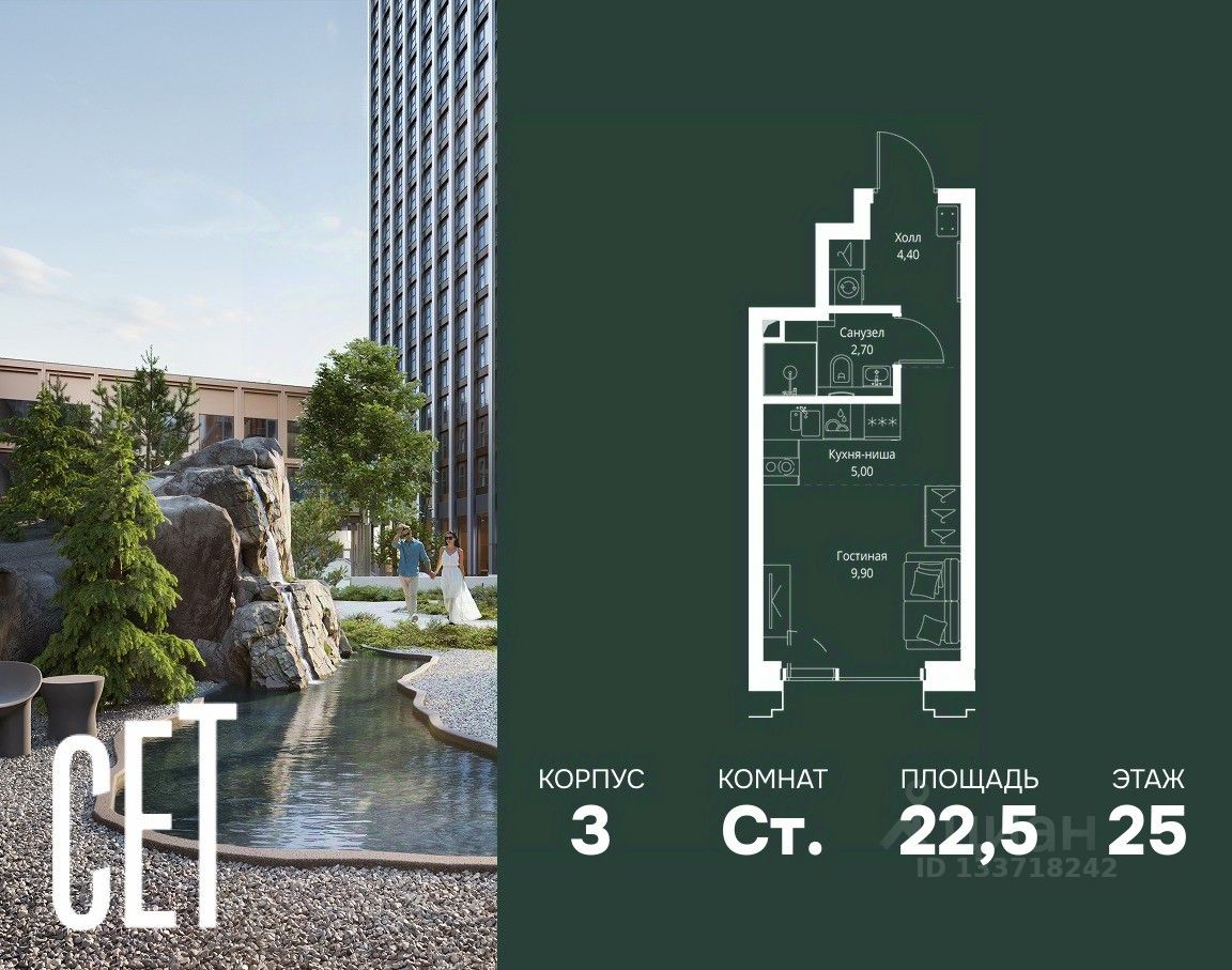 В ЖК Сет продается студия площадью 22.50 м², расположенная в корпусе 3, на 25 этаже 45 этажного дома.