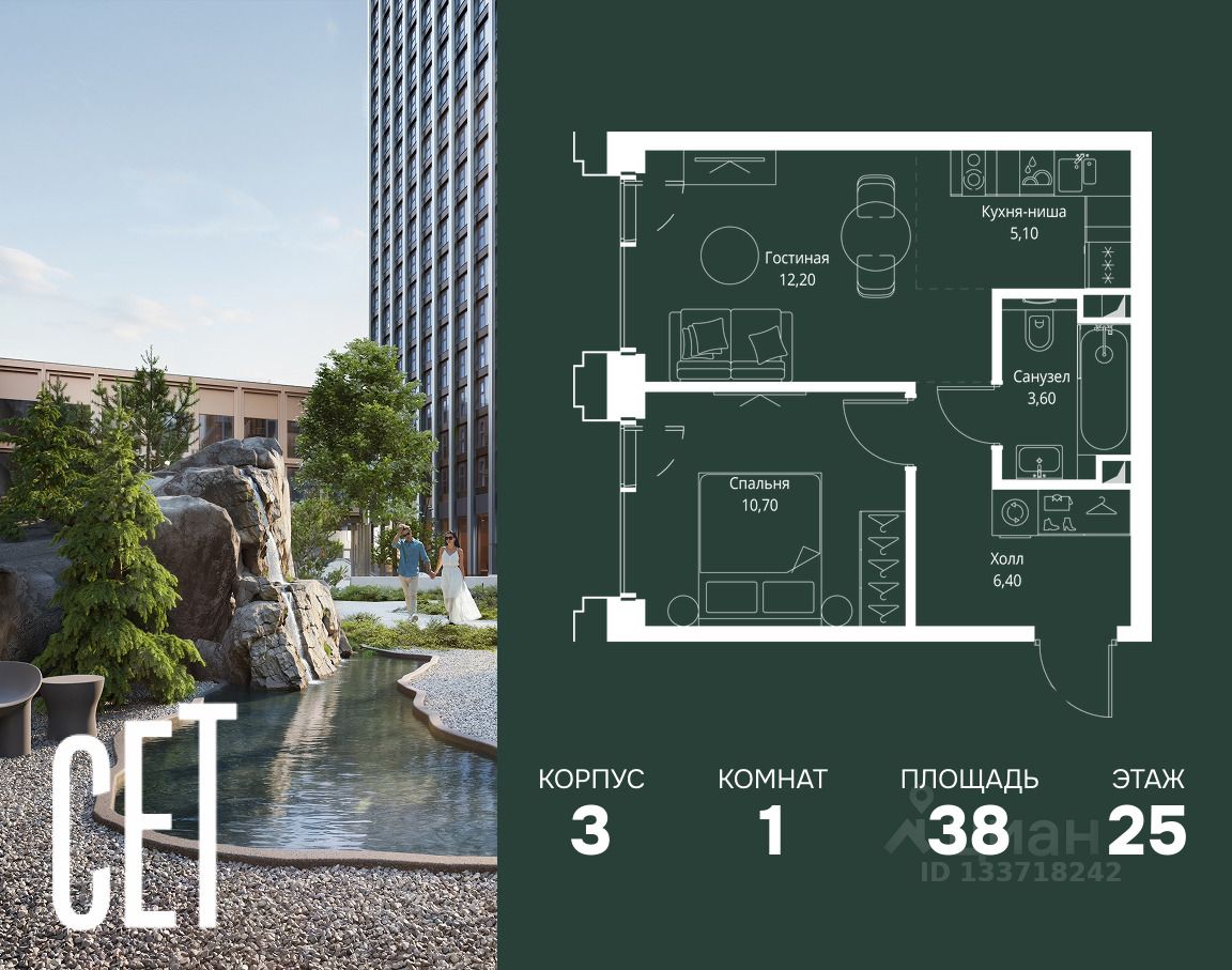В ЖК Сет продается 1-комнатная квартира площадью 38 м², расположенная в корпусе 3, на 25 этаже 45 этажного дома.